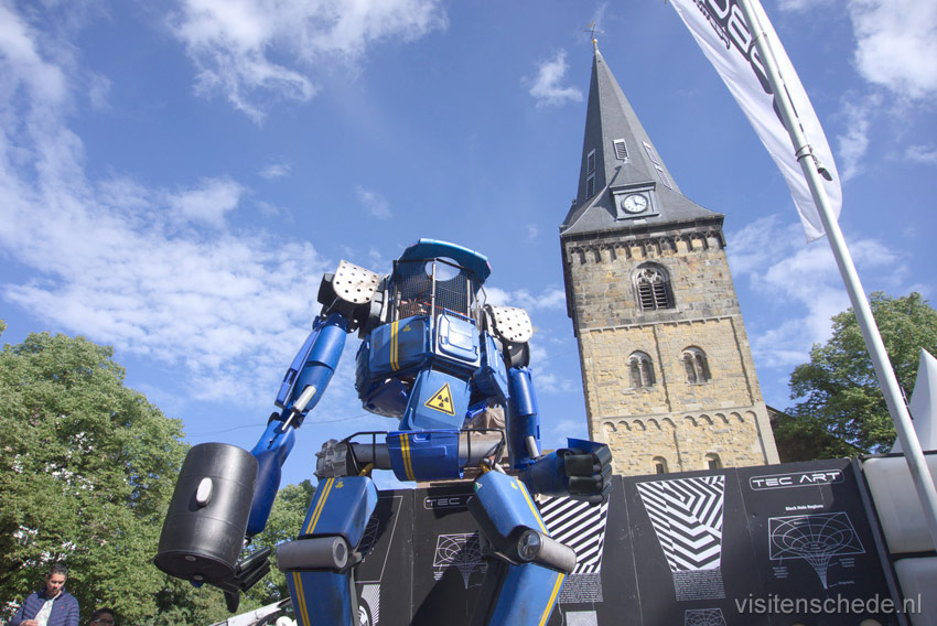 A huge robotic figure in front of the Grote Kerk during an art expo. (2017-09-13)